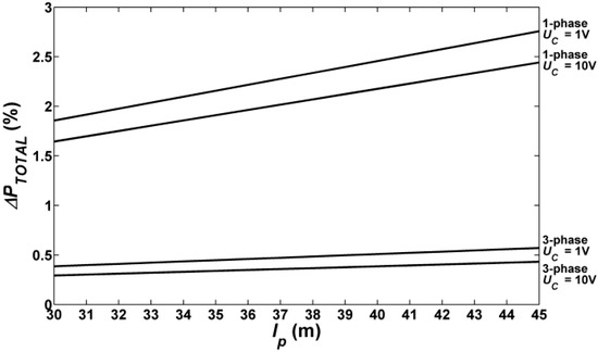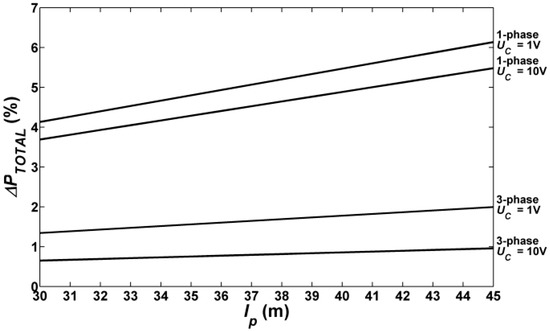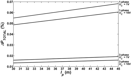 Figure 8 and Figure 9 show the dependence of the percentage of total active power losses ΔPTOTAL in the road lighting system as a function of the distance between the poles, respectively for installations with three and 30 LUM1 luminaires. For a three-phase circuit, UC = 10 V and a circuit with three luminaires, these losses increase from 0.013% for lp = 30 m to 0.016% for lp = 45 m. When the dimming voltage is reduced to 1 V, the losses are greater and range from 0.016% for lp = 30 m to 0.019% for lp = 45 m. In a circuit composed of 30 luminaires, the percentages of power losses ΔPTOTAL at UC = 10 V increase from 0.386% (lp = 30 m) to 0.571% (lp = 45 m). With full dimming of these luminaires, ΔPTOTAL = 0.296% for the distance between the poles equal to 30 m. Increasing the distance between poles up to 45 m results in an increase in losses to 0.432%. In a single-phase system with LUM1 luminaires, the power losses are greater than in a three-phase system. When operating with a minimum dimming (UC = 1 V) and for a circuit with three luminaires, they are equal to 0.055% (lp = 30 m) and increase with increasing distance lp = 45 m to 0.068%. With full dimming (UC = 10 V), ΔPTOTAL ranges from 0.049% at lp = 30 m to 0.060% at lp = 45 m. For installations with 30 LUM1 luminaires operating with UC = 1 V, the calculated power losses for lp = 30 m and lp = 45 m are equal to 1.856% and 2.757% respectively. In the case of work with a full luminous flux, these losses are equal to 1.644% for lp = 30 m and 2.442% for lp = 45 m.