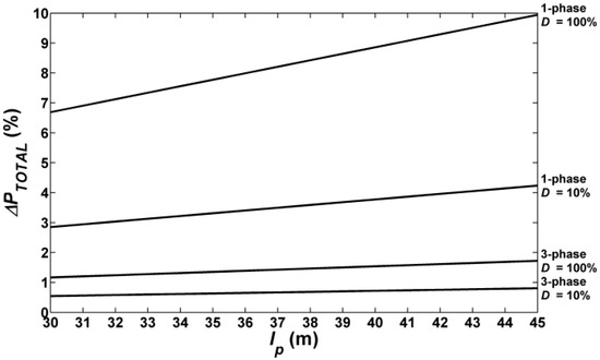The results of calculations of power losses for road lighting installations with three LUM3 luminaires as a function of distance between the poles are shown in Figure 12. The smallest percentage of power losses ΔPTOTAL occur for the three-phase installations and dimming D = 10%. They amount to 0.023% for lp = 30 m and increase to 0.028% for lp = 45 m. After changing the dimming, when D = 100%, these losses are between 0.052% and 0.063%. Increasing the number of luminaires results, of course, in the increase of power losses. For installations with 30 luminaires and D = 10%, they are equal to 0.546% (lp = 30 m) and 0.807% (lp = 45 m). Increasing the power of luminaires (D = 100%) results in an increase in power loss to 1.168% and 1.724% respectively. The calculated values of power losses ΔPTOTAL in the single-phase installation are much higher than in the three-phase system. They are for D = 10% and installations with three LUM3 luminaires, respectively, for lp = 30 m ΔPTOTAL = 0.082% and for lp = 45 m ΔPTOTAL = 0.103%. After increasing the power of luminaires to 100% of power, power losses increase to 0.193% and 0.241%. In an installation with 30 LUM3 luminaires (Figure 13), the percentages of ΔPTOTAL for the D = 10% dimming range from 2.850% to 4.236% for lp = 30 m and 45 m respectively. As can be expected, the increase in the power of luminaires (D = 100%) caused the losses increase up to 6.689% and 9.942%.
