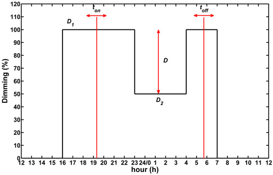 In the Polish reality, electricity is generated mainly in thermal power plants fired with hard coal or lignite. The production of electricity is inherently associated with the emission of greenhouse gases, primarily CO2. The amount of CO2 emissions to the atmosphere depends on the amount of consumed electricity. In Poland, the guidelines contained in [22] are used to calculate CO2 emissions. The generation of 1 kWh of energy is accompanied by the emission of 0.781 kg of CO2. The analysis of the effect of dimming and active power losses on the level of CO2 emitted was made for road lighting installations with 30 luminaires, respectively LED1, LED2 and LED2. The results of the calculations are presented in Table 4. The calculations were made without taking into account active power losses in energy bill (), for the case of three-phase () and single-phase () installation, taking into account the power losses. The CO2 emission was determined for luminaires with full luminous flux and for the installation working in accordance with the assumed schedule. A graphical presentation of this schedule is shown in Figure 14. The times of switching on (ton) and off (toff) the luminaires were determined using astronomical tables of sunrises and sunsets for Poland. For simplicity, the mean values of these times were assumed for months. Based on these calculations, the annual lighting time of luminaires equals 3950 h. It was assumed that between hours 23 and 4, the luminaires may glow with a reduced value of luminous flux. D1 means the first level of dimming equals 100% and D2 is the second level. Calculations were made for whole available range of dimming for all considered luminaires.