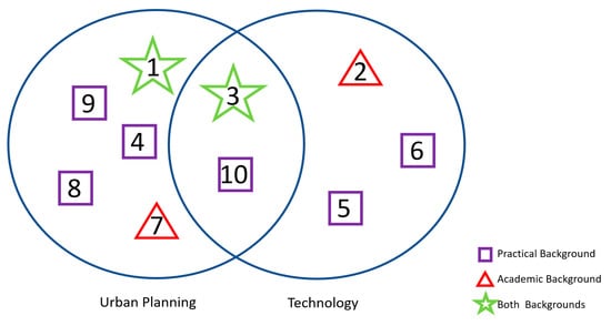 Of the sixteen invited participants, four declined, two answered insufficiently, and ten members offered sufficient responses, reflecting cooperation and keenness to take part in the study. The anonymity and confidentiality of responses were maintained throughout the period of the study. The Venn Diagram, Figure 1, identifies the expertise of the Delphi group members as categorized by the criteria in 1 above. The main areas of expertise, urban planning, smart cities and technologies, and both, is depicted by the circles and their intersection. Six members were urban planning experts, two members were smart city and technology experts, and two members were experts in both areas. The shapes refer to the type of job: academic or practical. Square is purely practical experience, Tringle is purely academic, and Star is both academic and practical experience.