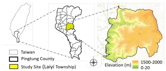 - Pingtung County Government. Laiyi Township Cencus; Department of Civil Affairs, Pingtung County Government: Pingtung County, Taiwan, 2017. [Google Scholar]