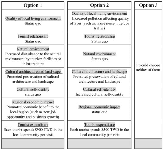 As a result, the filtered impacts included the aspects of economic benefit, natural environmental damage, environmental pollution, and socio-cultural promotion. In these aspects, we identified 7 attributes that were used to form the choice alternatives in the experiment. Those impacting attributes were: “pollutions affecting quality of lives”, “tourist conflicts”, “natural environment disturbance”, “cultural architecture and landscape preservation”, “cultural self-identity empowerment”, “employment creation”, and “tourist local expenditure”. The descriptions of the study attributes and their levels are reported in Table 1.