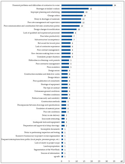 Moreover, the fourth most frequent factor is change orders, with a delay factor index equal to 14. The fifth most frequent factors are delay and shortages of materials, and poor site management and supervision, with a delay factor index equal to 14, while the sixth most frequent factor is poor communication and coordination between construction parties with a delay factor index equal to 12. The seventh most frequent factor is design changes and modification, with a delay factor index equal to ten, while the eighth most frequent factor is lack of qualified and experienced personnel, with a delay factor index equal to nine. However, the ninth most frequent factor is poor labor productivity and subcontractors’ incompetency, with a delay factor index equal to seven. The 10th most frequent factors are bid award for lowest price, lack of contractor experience, poor contract management, slow decision making from owner, and unrealistic project duration, with a delay factor index equal to six. Moreover, the 11th most frequent factors are difficulties in obtaining work permits, poor contractor management, and price escalation, with a delay factor index equal to five. The 12th most frequent factors are design errors, construction mistakes and defective works, poor qualification of consultants, shortage of equipment, the type of contract, unforeseen ground conditions, weather conditions, and political insecurity and instability, with a delay factor index equal to four. The 13th most frequent factors are construction methods, discrepancies between drawings and specifications, escalation of material prices, and poor site conditions, with a delay factor index equal to three. The 14th most frequent factors are delay in site delivery, inaccurate estimating, inadequate tools and equipment, and preparation and approval of shop drawings, with a delay factor index equal to two.