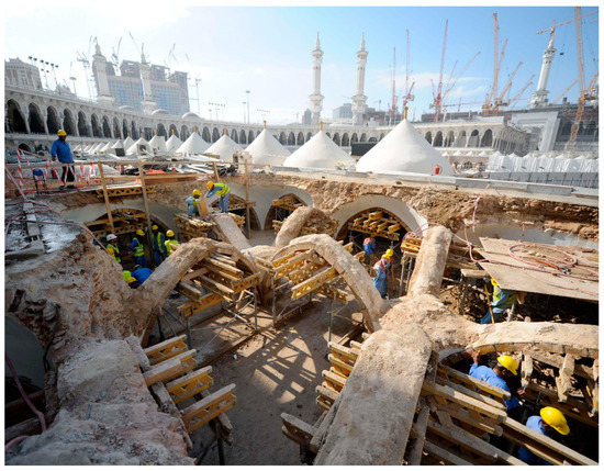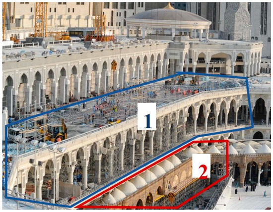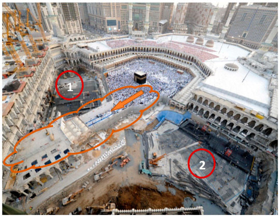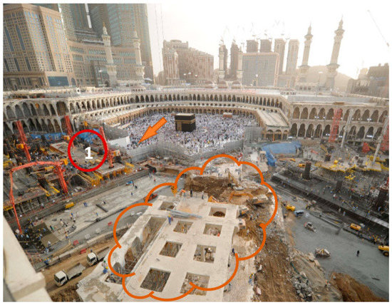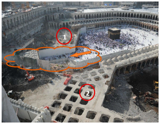 Another delay factor was mentioned during the interview sessions, which was providing a safe access for the visitors in order to move between the project areas safely. In fact, this factor was a common factor in both demolition and construction phases. It should be noted that the demolition works could be started in the safe access area only when providing an alternative safe access to the visitors. On the other hand, all the works had to be stopped in the safe access which existed in the construction area in order to serve the visitors until providing an alternative safe access. In fact, during the interview session with the experts, it has been highlighted that it was necessary to reserve a safe access area within the range of the demolition or construction area, hence, all the execution works in this safe access area had to be completely stopped to assure safety for the Mataf’s visitors. As a result, reserving this area from the working space led to a considerable narrowing of the allowable space for the working process and then a delay in the working process in the demolition or construction project areas due to two reasons. The first was the inevitability of reserving a relatively large space for safe access, due to the relatively huge number of hourly visitors to the main Mataf complex and the necessity of assuring their safety while crossing within the project area. On the other hand, the second reason was logistical, in that the safe access divided the demolition or construction area of the project into two separate areas that hindered the smooth movement of the equipment, tools, and laborers within the demolition or the construction areas of the project as in Figure 6.