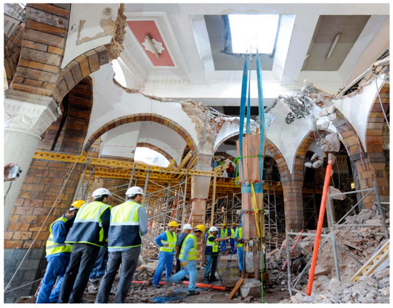 Furthermore, there was the factor related to dismantling archaeological and antiquity elements. This factor has been experienced due to the overlap between the archaeological and nonarchaeological areas in the project. As shown in Figure 4, Figure 5 and Figure 6, the archaeological domes elements are located under the nonarchaeological concrete slab. As a result of this overlap, the demolition phase in some areas was delayed until the dismantling of domes, columns, and other archaeological elements due to the special building materials used in constructing these domes. Such building materials are very sensitive and require special protection works, packing, numbering, and reinforcement before starting the dismantling work. In addition, all the protection procedures were carried out carefully in order to keep the building materials of the domes, arches, columns, and other archaeological elements in proper condition due to the limitations of having similar building materials nowadays. In fact, the protection procedures formed the basic foundations in order to assure the sustainability of the archaeological elements as in Figure 8 and Figure 9, especially after execution of the required testing and treatments.
