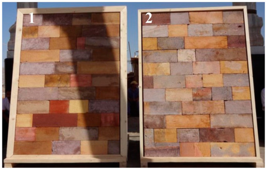Stone sample panels for sustainability purpose; panel number 1 shows the alternative stones, while panel number 2 shows the archaeological stones.