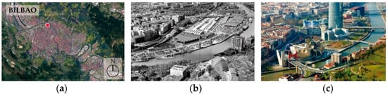 Location of the Guggenheim Museum (a) Site Map; (b) before Construction; (c) after Construction. (b,c) Source: Blogspot of La Vida Es Como Una Caja De Bombones (Article, 23 March 2011) [].