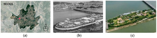 Seonyudo Park (a) Site Map; (b) Past; (c) Present. (b) Source: Search Google image “Seonyu Jungsujang (선유정수장)” []. (c) Source: Capture aerial view from Naver Map (official Website) [].