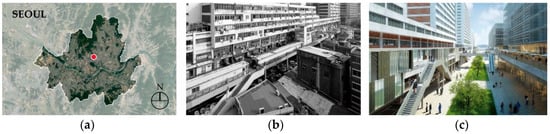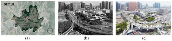 Seoullo 7017 (a) Site Map; (b) Past; (c) Present. (b) Source: Official Website of Seoul Metropolitan Government []. (c) Source: Official Website of Curbed (Article, 24 May 2017) [].