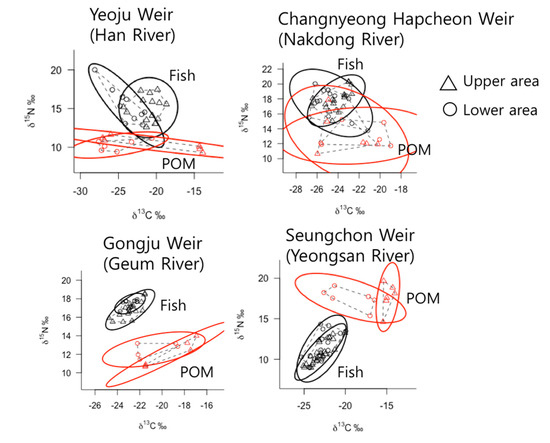 The ENSs of fish assemblages, including omnivores and predatory species, were markedly narrower in the Geum River than in the other rivers (Figure 2). The ENSs of fish communities showed the similar tendencies in all study sites; the upstream regions had narrower ENS with aggregations of each individual plot. In the Han River, there was less overlap between the ENSs for the upstream and downstream areas of the weirs, whereas in the other rivers, there was an overlapping but narrower area in the upstream area of the weir. The ENS of the upstream area was located at the inside of the downstream area ENS in Geum and Yeongsan Rivers. This trend is most apparent in the Geum River, where the ENS was the narrowest among the four rivers.
