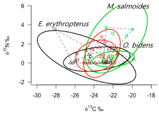 In downstream areas of the weirs, E. erythropterus and M. salmoides had larger ENSs than O. bidens (Figure 4). The ENS calculated by the stable isotopes of M. salmoides was largest as 7.33‰2, followed by E. erythropterus (6.62‰2). However, the ENS of O. bidens was much narrower (2.59‰2) than those two species. On the other hand, three predator species had narrow and similar ENSs in upstream areas of the weirs (E. erythropterus, 2.58‰2; M. salmoides, 1.01‰2; O. bidens, 2.11‰2). Consequently, E. erythropterus and M. salmoides showed marked differences in ENS between the upstream and downstream areas of the weirs, suggesting narrower food ranges in the upper areas. On the other hand, O. bidens showed a narrower range of ENSs and its ENSs were similar between upstream and downstream of the weirs. E. erythropterus had a wider range of ENSs for the variation of carbon stable isotope ratios (range of food sources), whereas M. salmoides showed vertical variations of nitrogen stable isotopes, indicating their trophic level (Figure 5).