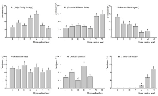 As shown in Figure 2, at different slope gradient level, the dominance of SH increased first then decreased with the highest dominance was at V slope gradient level (p < 0.01). The dominance of PR was low and changed mild at I–V slope gradient level, however, which increased significantly at VI–VII slope gradient level (p < 0.05). In addition, the dominance of PB obviously decreased with a significant difference at each slope gradient level (p < 0.01); and there was no PB detected at level VII. The dominance of PF maintains superiority with difference fluctuation at each slope gradient level (p < 0.01). The dominance of AB was changed with huge fluctuations and significant differences at each slope gradient level (p < 0.01). There was no related species of SS at I–IV slope gradient level, while the dominance of SS was increased obviously with a significant difference at V–VII slope gradient level (p < 0.01).
