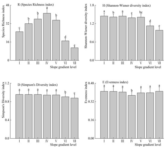 The effect of slope on the habitat can be reflected by plant diversity. As described in Figure 3, the richness index (R) increased first and then decreased with the increase of slope gradient level (p < 0.01). Furthermore, Shannon-wiener index (H) decreased with the slope gradient level increased. However, there was a significant difference of Shannon-wiener index (H) at each slope gradient level (p < 0.05). Similarly, the higher the slope gradient level, the lower the Simpson’s diversity index (D). There was no significant difference effect on the Simpson’s diversity index (D) at each slope gradient level (p > 0.05). In addition, the Pielou’s index of evenness (E) was lower at the slope gradient level IV than that at other slope gradient level (p < 0.05).