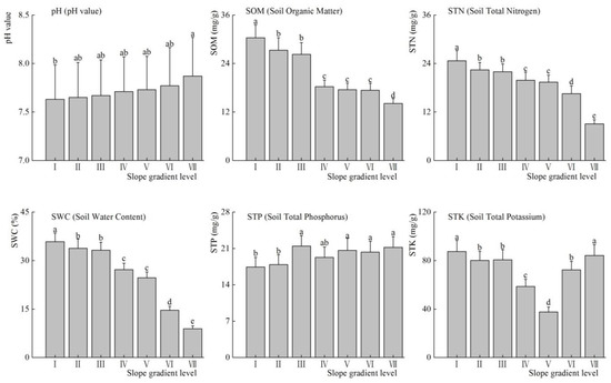 Figure 4 shows the effect of slope on the physical and chemical characteristics of the soil. The pH value slightly increased with slope gradient level increased (p < 0.05). In addition, Soil Organic Matter (SOM), Soil Total Nitrogen (STN) and Soil Water Content (SWC) were obviously decreased with the slope gradient increase at each slope gradient level, respectively (p < 0.05); and the Soil Total Phosphorus (STP) increased with the slope gradient increase with no significant difference at each slope gradient level (p > 0.05). However, Soil Total Potassium (STK) decreased first and then increased with the slope gradient increased (p < 0.01).