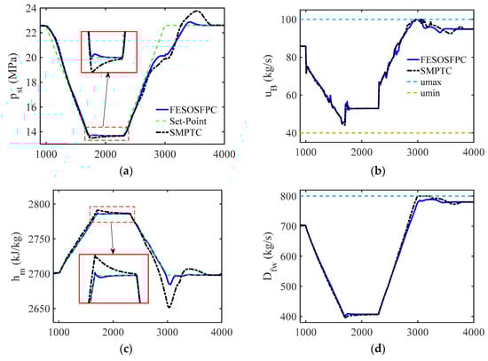 However, it is extremely challenging to control a USC boiler–turbine unit because of the nonlinearity, the coupling among multi-variables, and the hard constraints on the manipulated variables. To overcome these issues, various control strategies for a boiler–turbine system have been studied, such as robust control [2], optimal control [3], intelligent control [4], sliding model control [5], active disturbance rejection control [6], model predictive control (MPC) [7], etc. The aforementioned methods have significantly improved the performance in some respects but also suffer from some deficiencies. Robust control is often too conservative for the purpose of ensuring the performance in a critical case. The online computation cost of intelligent control methods is huge, which limits their practical application. The chattering phenomenon of the sliding model control will damage the protection of an actuator. On the other hand, MPC is regarded as the most promising control approach because of the ability in dealing with the multi-variable constraint problems explicitly [8,9]. In recent years, MPC has been used in the dynamic stabilization of DC microgrids [10], control of electric vehicles [11], load frequency control [12], and control of DC–DC converters [13], achieving good simulation and experimental results.
