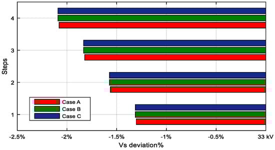 Load 1 simulations were executed at several active power levels of 0%, 20%, 40%, and 60%, while the reactive power levels were 0%, 25%, 50%, and 75% respectively, as depicted in Table 5. The apparent power levels were 0%, 20.71%, 41.43%, and 62.15%. For load 2, active, reactive, and apparent power levels were of 0%, 16.67%, 33.33%, and 50%, implying that the same level of increment was used for the various steps. The percentage of sending voltage deviation from the nominal voltage of 33 kV for different steps in Cases A–C is presented in Figure 4. It shows that the differences between Cases A–C were very small and unremarkable. It also depicts that the load increase in each step brought about an increase in the sending voltage deviation from the nominal voltage value of 33 kV. Equally, Figure 5 shows that the deviation of receiving voltage in Cases B and C was lower than that of Case A owing to the power injected onto the grid at the end of the 33 kV MV transmission lines. It can be noticed that deviations in Cases B and C were very close to each other.