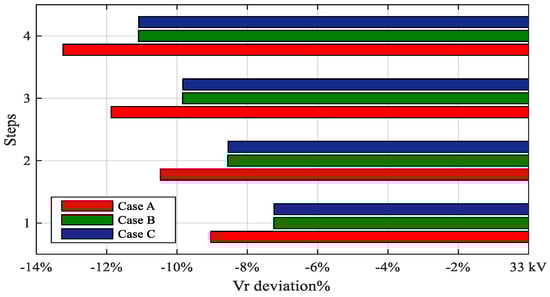 Percentage of receiving voltage deviation from the nominal voltage of 33 kV for different steps in Cases A–C.