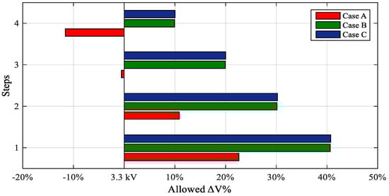 Percentage of allowed additional voltage drop for different steps of Cases A–C.