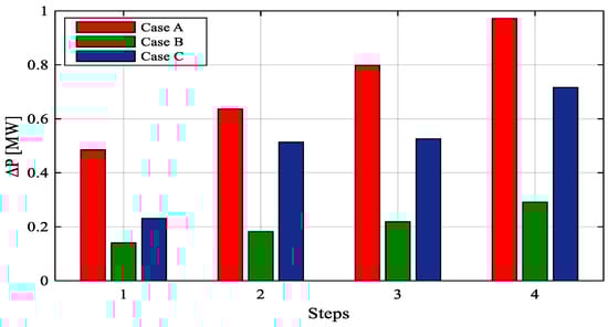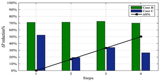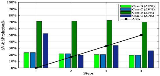 From Figure 8, it is observed that the percentage of power loss reductions for different steps in Cases B and C compared with Case A decreased for all cases and steps, but the reduction in Case B was higher. The reduction in all steps was generally the same in each case. The apparent power was the percentage increase in load, and as the load increased, the results became more favorable.
