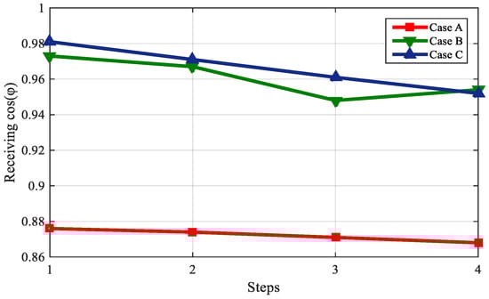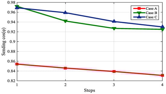 The sending power factor for different steps of Cases A–C is plotted in Figure 9. In this analysis, the sending power factor for Cases B and C was higher than that of Case A, ranging between 0.97 and 0.93, whereas the result for Case A was between 0.86 and 0.83. Note that the sending power factor for Case C was higher than that of Case B. The receiving power factor for different steps of Cases A–C is shown in Figure 10. The result here was like that depicted in Figure 9, where the power factor for Cases B and C was higher than that of Case A. The power factor values recorded for Cases B and C ranged between 0.99 and 0.95, whereas the values observed for Case A were between 0.88 and 0.87. Figure 10 shows that the sending power factor of Case C was higher than that of Case B.