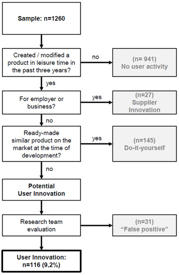 In the screening process, we applied the procedure initially developed by [14] and refined in [26]. This method identifies the respondents whose innovations are qualified as user innovations and are thus (1) not job-related; (2) not available in the market; and (3) functionally novel and consequently contains user-developed content [14].