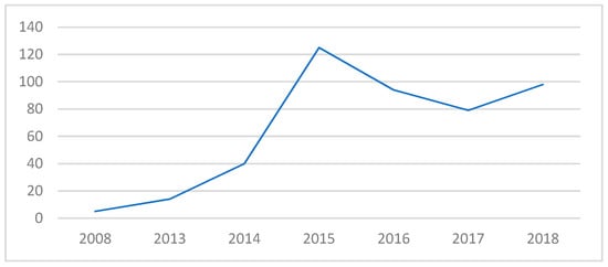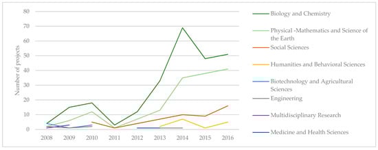 Figure 2 shows that since 2011, the number of projects developed in this field has significantly increased. Fifty percent of the research projects identified as related to sustainability belong to the areas of Biology and Chemistry, 31% to Physics and Mathematics and 10% to Social Sciences and humanities. Only 1% of these projects were registered as multidisciplinary research. The most frequent disciplines involved in these projects are ecology, biology and earth sciences, whereas Economics is the only discipline in the area of the Social Sciences and Humanities with 10 or more projects related to sustainability in the period analyzed.