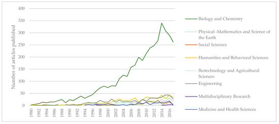 Figure 3 shows the increase in the number of publications related to this field between 1980 and 2017, particularly accentuated in the areas of Biology and Chemistry.