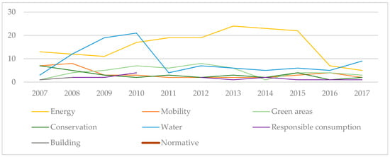 Figure 6 shows the distribution of these initiatives distinguishing them by area and the year they were reported. Most of these initiatives have taken place in CU, the main campus of the University, but some of the new campuses of the University have been important spaces of innovation for sustainable management.