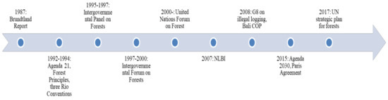 Since the 1992 non-legally binding authoritative statement of principles for a global consensus on the management, conservation, and sustainable development of all types of forests (Forest Principles), the understanding of SFM at the global level has confirmed that the concept embodies—with equal weighting—multiple values, such as social, economic, ecological, cultural, and spiritual values [32]. The concept of SFM has been framed as a principle to follow or respect, and as an objective to achieve [11,33,34], namely that all types of forests should be managed sustainably. Key policy developments relevant to SFM are shown in a timeline in Figure 1. Various definitions of SFM have been developed, reflecting how SFM has a different meaning for different people, even at different times.