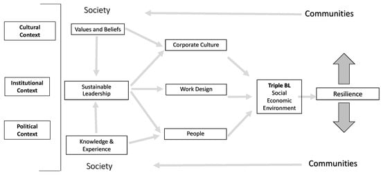 Finally, the sustainable leadership model draws attention to the fact that even indicators incorporated into the triple bottom-line are not ends in and of themselves. Rather they contribute to the creation of organizations, communities, and societies with the resilience to withstand shocks and unforeseen events [25,26,53,61,62,63,64]. This feature of the conceptual model further highlights the long-term perspective adopted in the sustainable leadership literature [24,25,28,41,43,61,64,65]. This conceptual model informed the current study and its interpretation of the results.