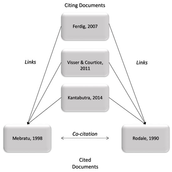 In Figure 3, the Mebratu [19] and Rodale [75] articles are considered ‘co-cited documents’ because they both appear in the reference lists of documents located in the review database. In Figure 3, each of the ‘co-cited documents’ [19,75] would accrue three co-citations. From the perspective of science mapping, these articles are considered ‘intellectually related’ by virtue of their co-citation by other scholars [34,69].