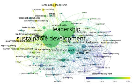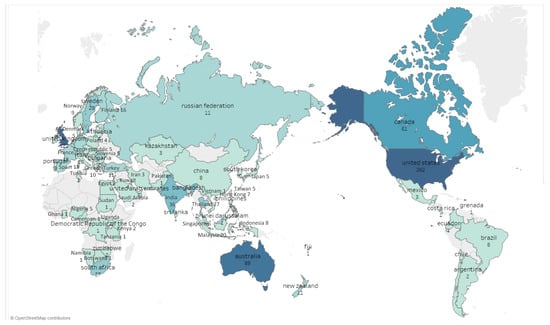 The heat map in Figure 5 shows that SL knowledge production has been concentrated in the USA, Canada, UK, and Australia. These four societies account for five hundred and seventeen or 54% of our full corpus of SL documents. This finding is consistent with a broader trend in the management literature that finds a predominance of Anglo-American scholarship in management journals [77]. For example, the author’s recent bibliometric analysis of The Leadership Quarterly found that Anglo-American scholarship accounted for over 75% of all articles published in the journal since its inception in 1990 [78]. Thus, the predominance of the Anglo-American scholarship should not be interpreted as evidence of greater interest in sustainability within these societies, but rather as a feature of scholarly publication in international management journals.