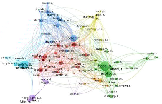 Out of a total of thirty-five thousand six hundred and eighty-seven authors in the author co-citation network, one hundred and forty-five scholars met a threshold of at least twenty author co-citations. Figure 6 displays the eighty most highly co-cited authors in the co-citation network. The most highly ‘co-cited authors’ were Bass (158), Avery (152), Hargreaves (129), Avolio (128) and Kantabutra (101). Notably, the list of the top twenty co-cited authors on sustainable leadership, included six scholars who were not represented in the review database—Bass, Pfeffer, Porter, Senge, Argyris, and Mintzberg. Their inclusion in the co-citation map derives from the influence of their broader conceptual and empirical contributions to the literature in leadership and management which was cited by authors writing on sustainable leadership.