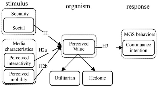 Many studies have tried to explain mobile microblog usage by using the leading technology acceptance model or its extension [8,9]. The process which underlies citizens’ continuous usage of mobile government microblogs has seldom been explored. The present study therefore adopted the stimulus–organism–response (SOR) framework [10] to investigate citizens’ continuance of mobile government microblogs by focusing on the stimuli from social influence and media characteristics on their value perceptions. Specifically, this study examines (1) How the mobile government microblogs stimulate citizens (i.e., social influence, perceived mobility, and perceived interactivity), influencing their reactions (i.e., perceived value), and subsequently affecting their coping responses (i.e., continuance intention of using mobile government microblogs). (2) What are the different roles of perceived hedonic value and perceived utilitarian value on citizens’ evaluations of mobile government microblogs, and what subsequently shaped their continuance intentions?