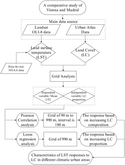 A flow chart describing the methodology for studying the response of land surface temperature to land cover in different urban areas.