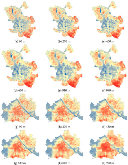 Figure 2. Illustration of land surface temperature (LST) images as the scale increases. Present images are the mean LST in each grid at the scale ranging from 90 m to 990 m ((a–f) are of Madrid, (g–l) are of Vienna). The original images of LST at 30 m resolution are in Figure 3. - We acquire the mean LST of each grid as the dependent variable, and the proportion of each LC type on the corresponding grid as the independent variable. A Pearson correlation analysis is firstly conducted at each of the analytical scales to identify the correlation coefficient between the LST and the proportion of each LC. With the increase of the spatial scale, the resulting analysis allowed for the determination of the change of the LST-LC correlation coefficient based on variable LC combinations, which provides an interpretation of the suitable scale for analyzing the LC–LST relationship.