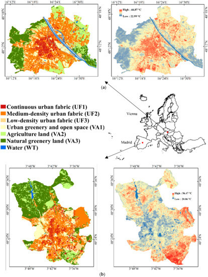 Land cover and land surface temperature maps from summer 2013 of (a) Vienna; (b) Madrid.