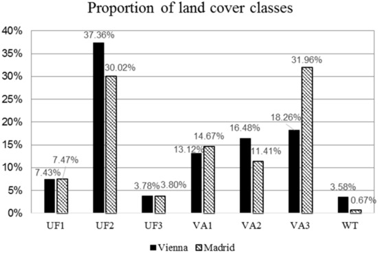 Figure 4 shows that the proportion of the seven LC classes in the two study areas are similar, which is one of the reasons for choosing these two cities for comparative analysis. The main difference between the two cities is that the proportion of natural greenery land (VA3) is higher in Madrid than Vienna, by 13.70%. Moreover, the species of VA3 are different in the two cities: a large area of grassland and shrubbery is distributed in the north of Madrid [65], while the main type of VA3 in Vienna is forest [66].