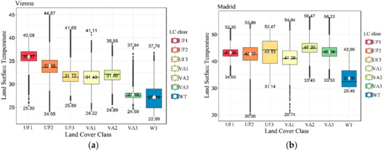 To obtain detailed information about the different LST response to each LC, the minimum, maximum, and mean values of LST based on each LC types are calculated and shown in Figure 5. The range of LST value calculated in the whole study area is 14.53 °C higher in Madrid than in Vienna. The highest temperature was observed in medium-density urban fabric (UF2) in Vienna and in agricultural land (VA2) in Madrid.