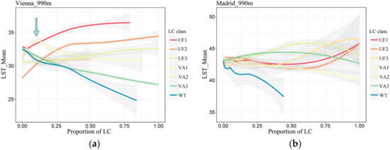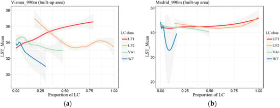 Previous studies have shown that LST is directly influenced by land surface characteristics [12,15,16,17,72], which includes the attribute, shape, composition, and configuration of land cover (LC) [34,69,73]. We observed that Madrid shows a low LST in built-up areas. To what extent can built-up areas display positive effects on LST at local scale? The effects of urban greenery and open space (VA1) decline with increasing scale in Vienna. What composition of urban greenery is necessary to perform a cooling function and to regulate the temperature? We found answers to these questions in a detailed study based on a regression analysis of LC proportion and mean LST at the 990 m analytical scale.