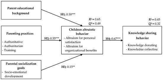 The value of R2 shows how well the proposed structural model explain endogenous construct while value of Q2 shows adequacy of predictive relevance of structural model. Yet, structure model is not indicative of how exogenous constructs predict endogenous construct (outcome of interest). A fit is not always a good way of evaluating predictive validity []. Therefore, recently Shmueli, Ray, Estrada, and Chatla [] suggesting to consider predictive validity and performance of PLS models. Predictive validity (out-of-sample prediction) refers to the ability of a model in the predication of output value with different data sample []. In line with previous research [,,,,], this study evaluates the predictive validity through cross-validations tests with holdout samples. Particularly, this study follows the approach suggested by Cepeda-Carrión et al. [] by dividing the original sample (n = 310) randomly into two subsamples, i.e., a training sample (two-thirds of the sample, n = 207) and a holdout sample (the remaining sample, n = 103). Second, the training sample is used to estimate the parameters in the structural model (weights and path coefficients). Third, using the holdout sample, each sample case is standardized. Fourth, the construct scores for the holdout sample are formed as linear combinations of the respective sample using the weights obtained from the training sample. Fifth, the construct scores for the holdout sample are standardized. Sixth, for the two endogenous constructs (in the structural model using holdout sample), the predictive scores are created by using the path coefficients obtained from the training sample. Finally, for the two endogenous constructs, the correlation between their predictive scores and construct scores (children altruistic behavior, r = 0.70, p < 0.01; and knowledge sharing behavior, r = 0.51, p < 0.01) suggesting that the structural model in this study has acceptable predictive validity.