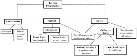 Diversification strategies also include the reorientation of the market focus, such as the new cycle routes in a previously under-exploited area in Hungary, which created a diversified range of small business activities, e.g., sport or health activities and businesses based on culinary heritage and planned events. Consequently, these changes required diversification in terms of adapting and/or acquiring new technologies, knowledge and technical skills to develop new products and cater for the needs of new markets including professional and training of current and new members of staff [61]. Market diversification can also be used as a strategic tool in avoiding conflict and tension, such as the development of international tourism and territorial enclaves in third world countries and Muslim countries, where the tourism offering is separate geographically between international and domestic markets [31]. Related and unrelated strategies can guide the development of a systemic approach to regional diversification including links between firms, institutions, and other knowledge actors as well as between sectors, which may diverse into offerings new products and markets in line with their marketing strategies, risk assessment and identification of place based resources.