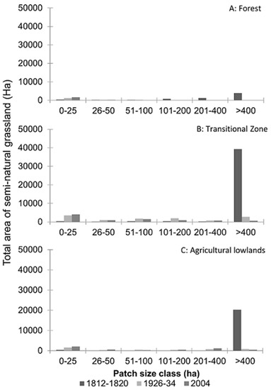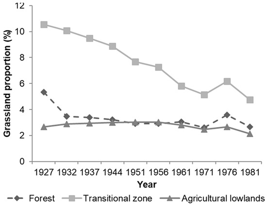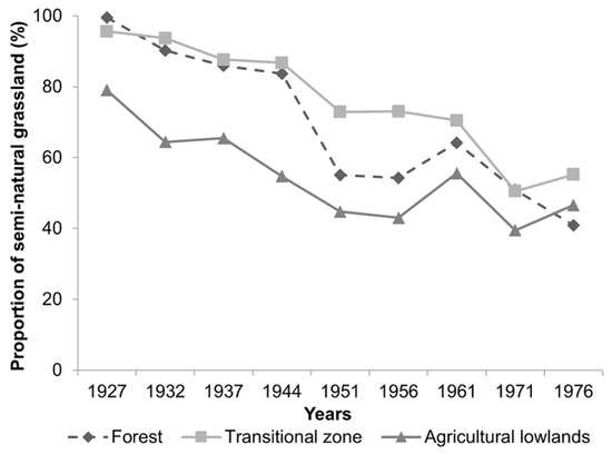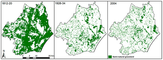 | (C) Remaining proportion of semi-natural grassland by comparison of 1926–1934 to 1976 (see Figure 5) | 0.59 | 0.42 | 0.41 |