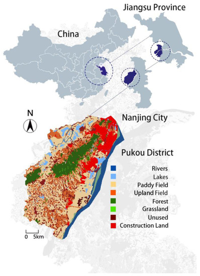 The Pukou District (118.21° E–118.46° E, 30.51° N–32.15° N) is located in the northwest of Nanjing, China. The region covers an area of 913 km2. It is located on the northwestern edge of a hilly area between Nanjing, Zhenjiang and Yangzhou with highlands in the middle region and lowlands in the south and north (Figure 1). It has a subtropical monsoon climate with distinct wet and dry seasons. Along with rapid economic development and urban expansion, the Pukou District is increasingly facing the following contradictions and conflicts between ecological protection and economic development: