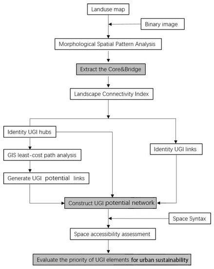 All steps in this study are illustrated in Figure 2 and are explained in the subsequent sections: (1) extracting the UGI elements and determining the core area and bridge area in terms of MSPA; (2) identifying the UGI hubs and links by landscape connectivity; (3) adopting the least-cost path model to construct the potential UGI network; (4) evaluating the priority of network through the spatial syntax model.