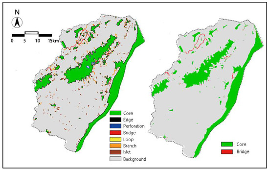 MSPA is very sensitive to the resolution of the land-use image (Figure 3), and varied parameter settings may result in different outputs of MSPA. When the resolution of the land-use map was set at 30 m, 87.8% of the foreground was classified as core area, with only 0.2% of the foreground classified as bridge area. With a resolution of 120 m, 58.6% of the foreground was classified as core area, while 10% of the foreground was classified as bridge area. Increasing the width of the edge increases the minimum size of the core (Figure 4). By reviewing the ecological corridor width threshold in landscape planning research [31,32], we set the pixel size and edge width to 90 m.