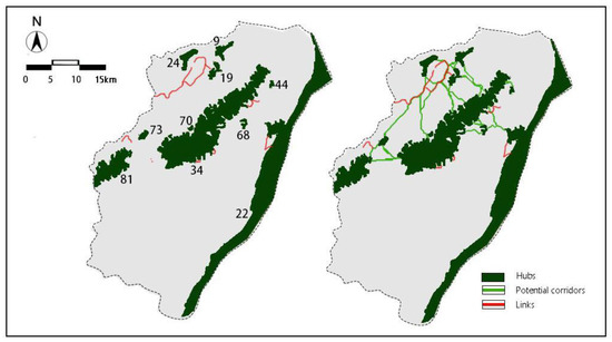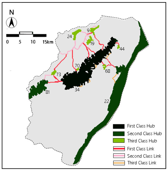 The second step was to identify the UGI hubs and links. The Probability of Connectivity (PC) index was used to measure connectivity that has the richest connection model of the measures with widespread use in connectivity evaluation. The delta of PC represents the contribution of a patch to the connectivity among other patches [32]. It allows the identification and prioritization of important patches that mostly contribute to overall landscape connectivity.