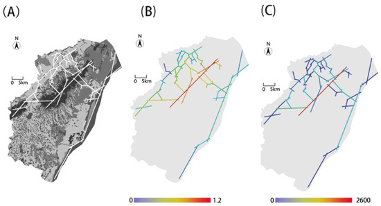 The axial map (A) and the general integration value (B) and choice value (C) map of the research area (the warmer color indicates higher values, the same below).