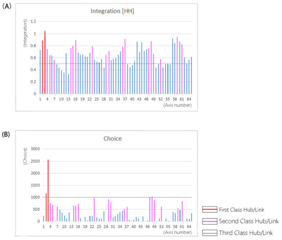 Space syntax was used to analyze the UGI network to quantitatively measure spatial integration accessibility. The network was first converted to a convex space based on the “axis method”, which can be used to generalize space through straight lines according to a set of established rules, and transform the space into the system which was composed of straight lines, hence creating the axis system of the research area. In addition, syntax variables of space syntax, such as connection, control, depth, integration and choice, were used to analyze the spatial structure of GI. Two main metric variables were used in space syntax: (1) Integration (evaluating whether the UGI network is easily reachable); and (2) Choice (clarifying the spatial benefit-cost ratio of the UGI element) [38]. Integration and Choice can be used for the priority evaluation of key elements in the GI network based on space accessibility for people. The general integration and choice of the axis system were calculated in this way to determine hubs and links in this network of research area. After comparing the space syntax index of each axial, we divided the UGI elements into 3 classes by their general integration and choice index (Table 2). The first class of hubs and links should be protected with space priority. The calculation of the relevant index was applied following the Depthmath’s User’s Manual.