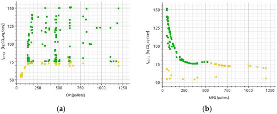 Starting from the environmental KPI, from Figure 2a it can be seen that varies approximately from 75 to 150 kg CO2 eq./day, while solutions with kg CO2 eq./day are all unfeasible. The design space includes (feasible) solutions with the same (e.g., 75 kg CO2 eq./day), which stem from very different values of OP (from 150 up to 1200 pallets). Similarly, the same value of OP (e.g., 150 or 450 pallets) generates very different . Therefore, the relationships between these parameters are not immediately easy to identify. The correlation analysis confirms this consideration: indeed, the correlation between OP and is very weak (0.09). Figure 2b shows, instead, a clear relationship between and MPQ. More precisely, the increase in MPQ involves a corresponding decrease in , which is confirmed by the quite strong negative correlation (−0.68) between these variables. When MPQ is higher, Company A will use recovery operations less frequently, resulting in lower CO2 emissions of the retrieving activities and in a better environmental performance.